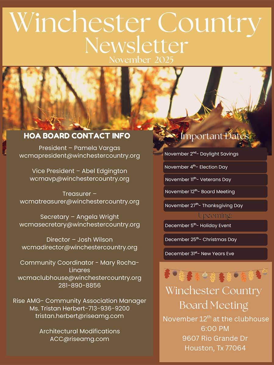 We have a few individuals dedicated to assisting with Winchester Country, but you only need to know that you can contact us at support@riseamg.com or 713-936-9200. We will get your request to the right person. Ultimately, your Association Manager, Tristan Herbert is responsible for ensuring all Rise service/support teams are meeting the needs of the association. Tristan will also provide direct reporting to the Board on the status of the association’s operations.